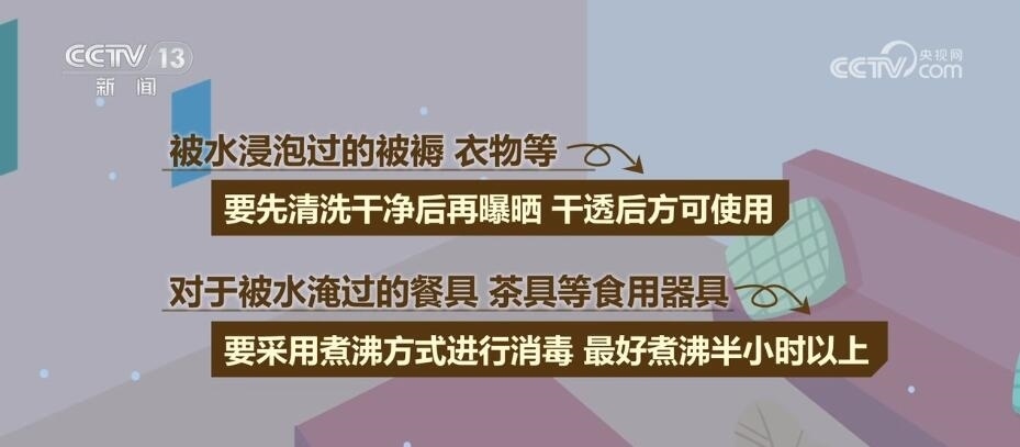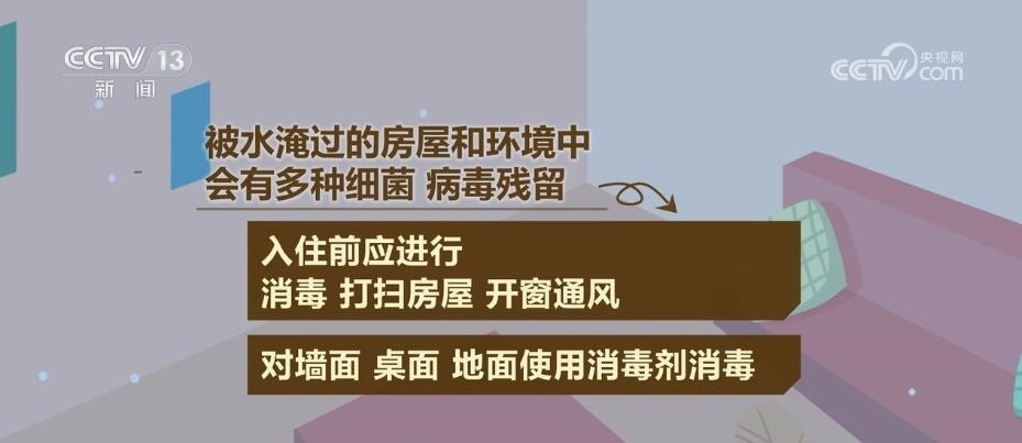 被水淹過的房屋和環(huán)境中會有多種細菌、病毒殘留,入住前應進行消毒,打掃房屋,開窗通風;對墻面、桌面、地面使用消毒劑消毒;被水浸泡過的被褥、衣物等,要先清洗干凈后再曝曬,干透后方可使用;對于被水淹過的餐具、茶具等食用器具,要采用煮沸方式進行消毒,最好煮沸半小時以上。