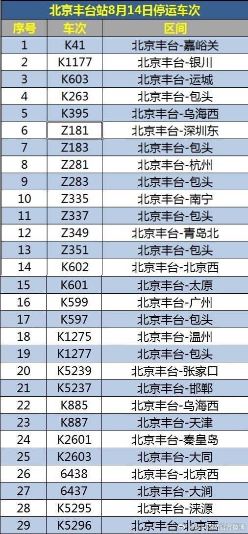 受水害影響,8月14日北京西站、北京豐臺站部分列車停運(yùn)