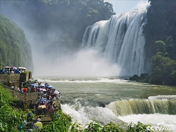 8月11日,貴州安順,游客在黃果樹瀑布景區(qū)游覽。暑期以來,黃果樹風(fēng)景區(qū)瀑布水勢磅礴、飛瀉而下,進(jìn)入最佳觀賞季。