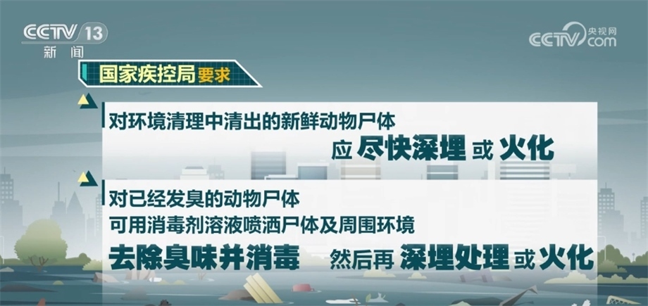 對環(huán)境清理中清出的新鮮動(dòng)物尸體應(yīng)盡快深埋或火化,對已經(jīng)發(fā)臭的動(dòng)物尸體,可用消毒劑溶液噴灑尸體及周圍環(huán)境,去除臭味并消毒,然后再深埋處理或火化。