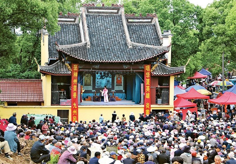 為豐富群眾文化生活,江蘇省南京市高淳區(qū)椏溪街道藍(lán)溪村專(zhuān)門(mén)邀請(qǐng)杭州青年越劇團(tuán)來(lái)村里演出,讓村民在家門(mén)口享受文化大餐。圖為2023年5月7日,藍(lán)溪村大山戲樓上,演員正在表演越劇《紅樓夢(mèng)》。 人民圖片 高曉平/攝