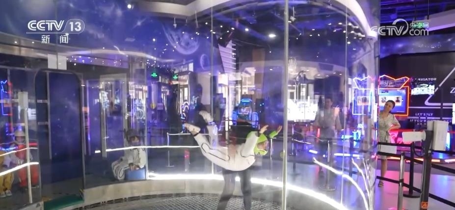 腹部朝下、身體張開、雙腿繃直,在完成這樣一個標(biāo)準(zhǔn)的飛行動作后,就可以在這個空洞中平穩(wěn)飛升到10多米高的空中,模擬體驗(yàn)跳傘的感覺。