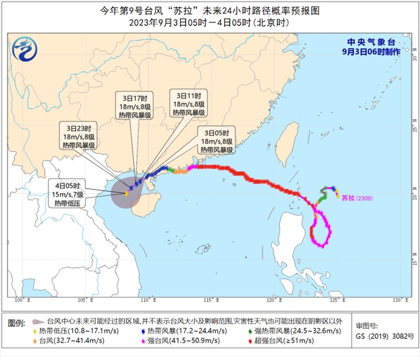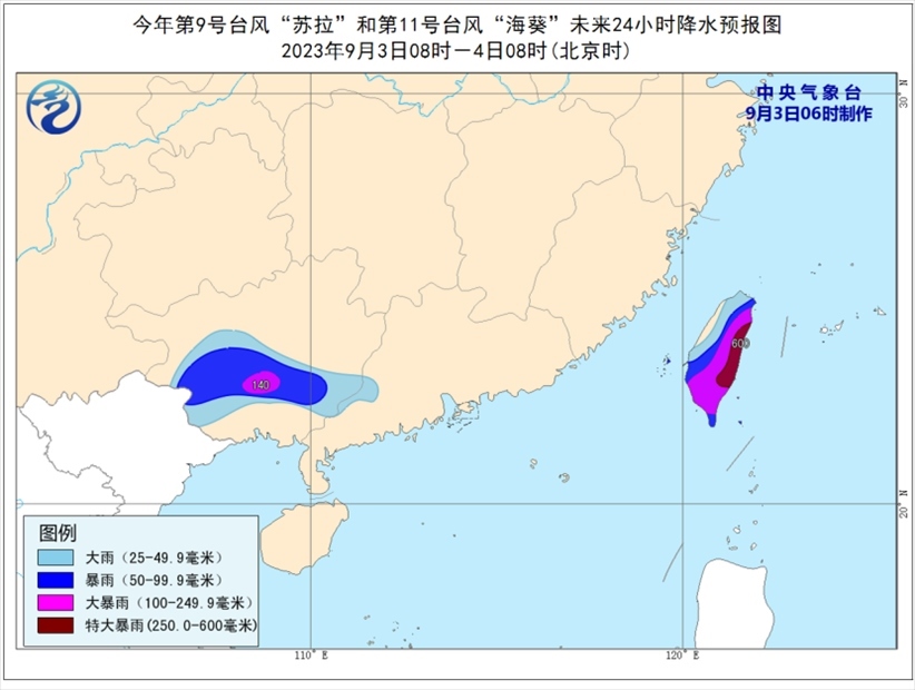 降水預(yù)報:9月3日08時至4日08時,受“蘇拉”和“??庇绊?,廣西中南部、廣東西南部、臺灣島等地部分地區(qū)有大到暴雨,其中,廣西中南部、臺灣島中東部等地部分地區(qū)有大暴雨,臺灣島東部部分地區(qū)有特大暴雨(250-600毫米)。