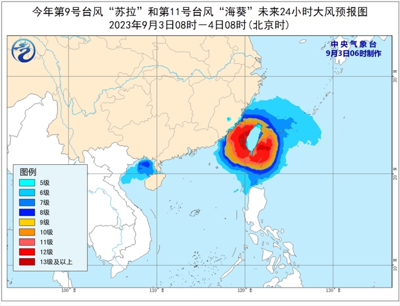 大風(fēng)預(yù)報:9月3日08時至4日08時,受“蘇拉”影響,北部灣、瓊州海峽以及廣西南部沿海、海南島北部沿海等地將有6-7級大風(fēng),其中北部灣部分海域?qū)⒂?級、陣風(fēng)9-10級的大風(fēng);受“海葵”影響,巴士海峽、臺灣海峽、臺灣以東洋面、東海南部及釣魚島附近海域以及浙江南部沿海、福建沿海、臺灣島沿海將有6-8級、陣風(fēng)9-10級大風(fēng),部分海域或地區(qū)的風(fēng)力有9-12級,陣風(fēng)13-14級,“??敝行慕?jīng)過的附近海面或地區(qū)的風(fēng)力有13-16級,陣風(fēng)17級。