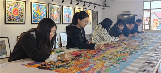 吉林省梨樹縣民間藝術(shù)家正在創(chuàng)作《關(guān)東七彩農(nóng)民畫、心系亞運向未來》農(nóng)民畫。受訪者供圖