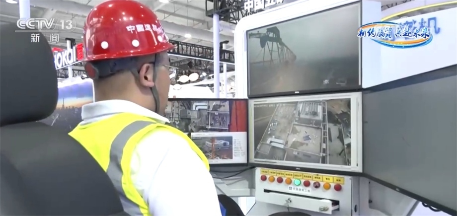 服貿(mào)會工作人員 趙晨曦:我現(xiàn)在控制的塔吊位于湖北省武漢市,距離展會現(xiàn)場1200公里?,F(xiàn)在我們來旋轉(zhuǎn)大臂,我們可以看到運(yùn)行過程非常流暢。接下來我們來落吊鉤,畫面也是幾乎沒有延遲。