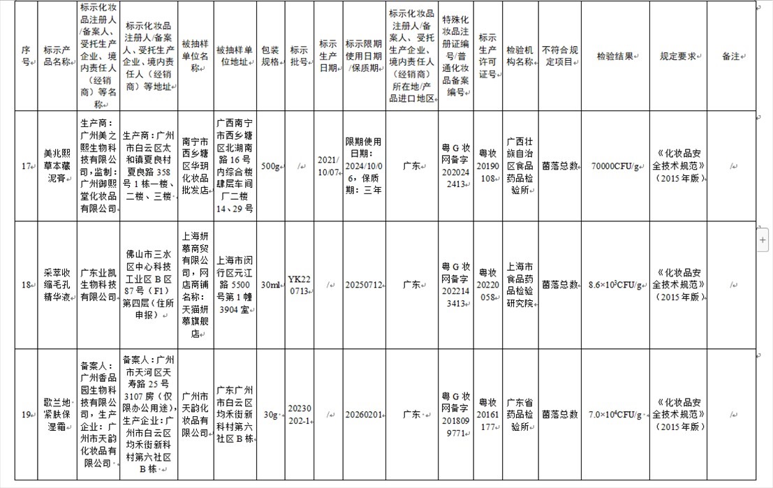 國(guó)家藥監(jiān)局網(wǎng)站今天發(fā)布通告稱,在2023年國(guó)家化妝品抽樣檢驗(yàn)工作中,經(jīng)重慶市食品藥品檢驗(yàn)檢測(cè)研究院等單位檢驗(yàn),產(chǎn)品標(biāo)簽標(biāo)示為廣州市天科化妝品有限公司生產(chǎn)的天科染發(fā)膏(自然黑)等23批次化妝品不符合規(guī)定(見(jiàn)下圖表格)。