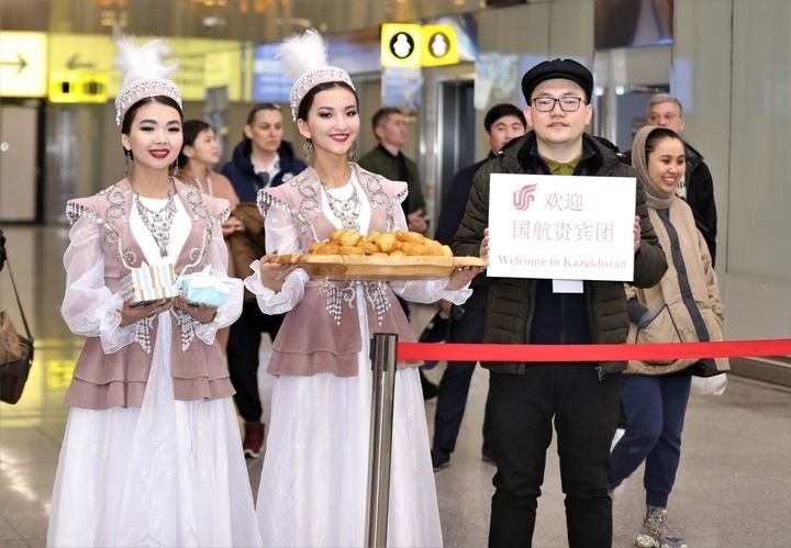 4月21日,在哈薩克斯坦首都阿斯塔納的納扎爾巴耶夫國(guó)際機(jī)場(chǎng),哈方工作人員為搭乘國(guó)航北京-西安-阿斯塔納航線首班飛機(jī)抵達(dá)的旅客舉行歡迎儀式。