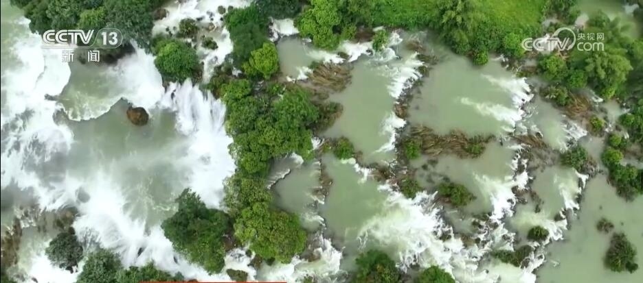 跟隨鏡頭,現(xiàn)在我們來到廣西崇左的德天跨國瀑布。它發(fā)源于廣西的歸春河,流向越南,又繞回廣西,最終在德天村遇斷崖形成瀑布。眼下,正值豐水期,德天跨國瀑布迎來最佳觀賞季。浩浩蕩蕩的河水從斷崖層層跌落,發(fā)出震撼的轟鳴聲,激起的水花騰空而上,讓人不禁感嘆大自然的神奇與美妙。