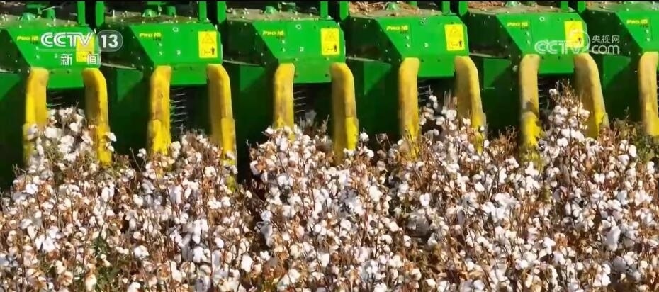 作為棉花主產(chǎn)區(qū),新疆棉花陸續(xù)進入采收季。現(xiàn)在您看到的是位于新疆昌吉瑪納斯縣的棉田。采棉機在田里穿行,所到之處,棉花從棉稈上脫離,氣流將棉花推送到儲存棉箱,采凈率高達95%以上。這樣一臺采棉機每天可采收700余畝棉花?,敿{斯是國家級優(yōu)質(zhì)商品棉生產(chǎn)基地。從播種到采收,這里的機械化,大大提高作業(yè)速度和棉花質(zhì)量。
