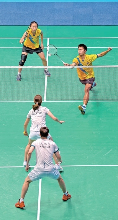 10月4日,杭州亞運(yùn)會(huì)羽毛球混合雙打1/8決賽,馬來西亞體育代表團(tuán)組合對(duì)陣泰國(guó)體育代表團(tuán)組合。圖為雙方運(yùn)動(dòng)員在比賽中。本報(bào)記者 伊霄攝