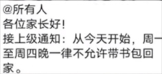 ·江蘇多所小學要求學生周一到周四晚不允許帶書包回家?教育局回應:本意是控制學生作業(yè)量,形式上的禁止已通知糾正。