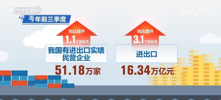 2023年前三季度,我國(guó)有進(jìn)出口實(shí)績(jī)的民營(yíng)企業(yè)51.18萬(wàn)家,進(jìn)出口16.34萬(wàn)億元,分別占整體的85.7%、53.1%,同比分別提升1.1個(gè)、3.1個(gè)百分點(diǎn)。