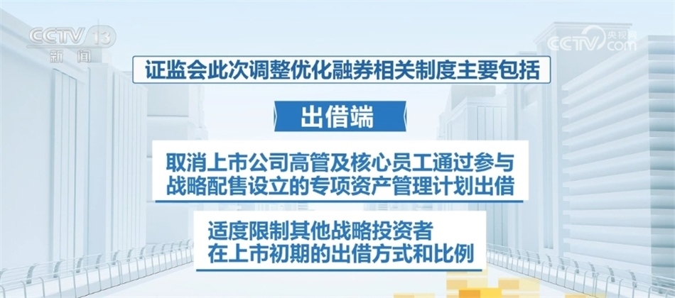 證監(jiān)會此次調(diào)整優(yōu)化融券相關(guān)制度主要包括:融券端,將融券保證金比例由不得低于50%上調(diào)至80%,對私募證券投資基金參與融券的保證金比例上調(diào)至100%;出借端,取消上市公司高管及核心員工通過參與戰(zhàn)略配售設(shè)立的專項資產(chǎn)管理計劃出借,適度限制其他戰(zhàn)略投資者在上市初期的出借方式和比例。