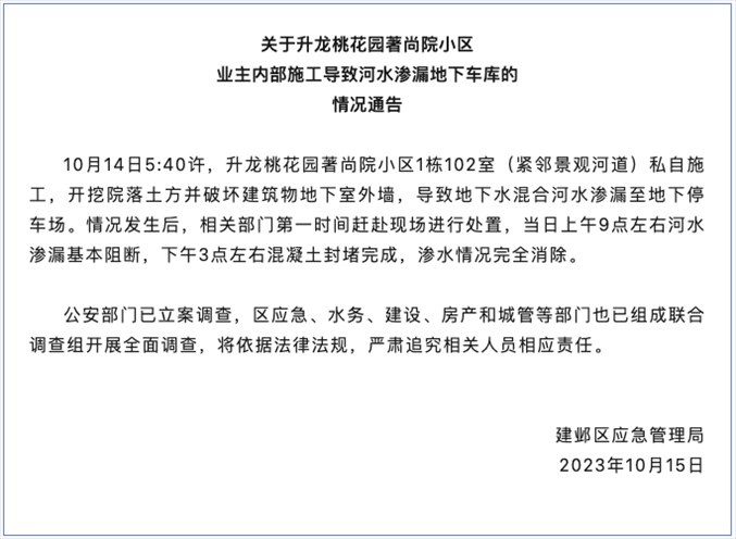 ·網(wǎng)傳南京一業(yè)主濫挖地下室致河水倒灌車(chē)庫(kù),官方通報(bào):多部門(mén)調(diào)查追責(zé)。