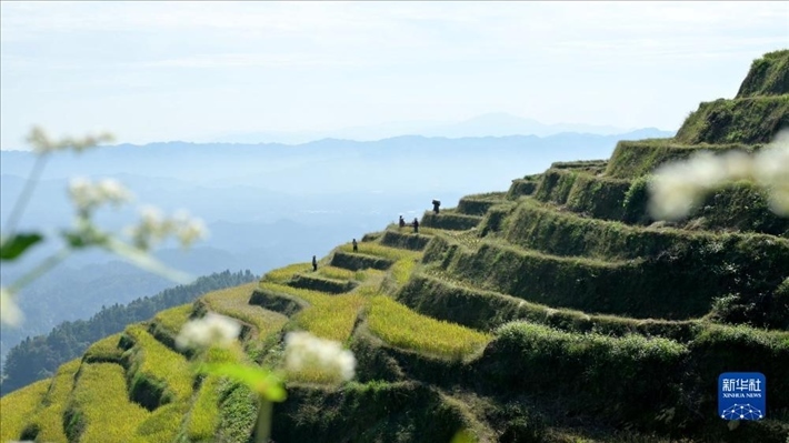 在湖南省婁底市新化縣水車(chē)鎮(zhèn)紫鵲界梯田,農(nóng)民采用人工方式收獲稻谷。