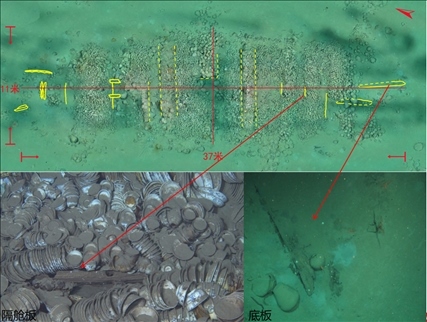 沉船遺址水深約30米,主體區(qū)域殘存有木質(zhì)船體和成摞擺放的船貨堆積,范圍約300平方米。考古發(fā)掘發(fā)現(xiàn),沉船船體殘長約16.95米,最寬處保存約4.5米,殘存9道隔艙板和10個船艙,單層板結(jié)構(gòu),發(fā)現(xiàn)桅座、龍骨板、龍骨補強材以及舭龍骨等船體構(gòu)件。