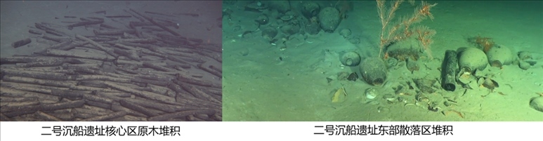二號沉船遺址位于一號沉船遺址東北約12海里處,由核心區(qū)和散落區(qū)組成,年代為明弘治年間。核心區(qū)為大量碼放整齊的原木堆積,長約21米,最寬約8米,核心區(qū)西北及東部各有一處由少量原木和陶瓷器散落形成的堆積。二號沉船暫未發(fā)現(xiàn)船體,僅在核心區(qū)原木堆積中發(fā)現(xiàn)一根疑似船構(gòu)件的條木。