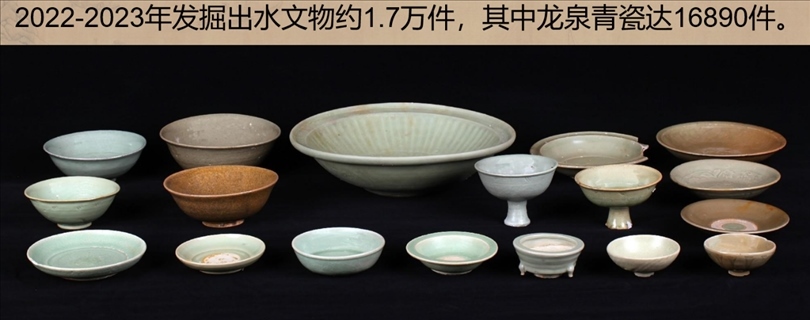 發(fā)掘出水文物標本約1.7萬件,主要為龍泉青瓷和陶罐、鉛錘、印章等船上生活、航海相關(guān)文物。其中龍泉青瓷數(shù)量達到1.6萬余件,器形包括碗、盤、碟、盞、洗、缽、香爐和高足杯等,年代為元代晚期,為典型的外銷貿(mào)易瓷。結(jié)合溫州朔門古港的考古發(fā)現(xiàn),推測該沉船可能是從溫州港出海前往東南亞的民間貿(mào)易商船。