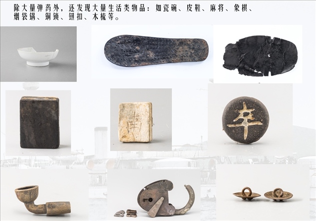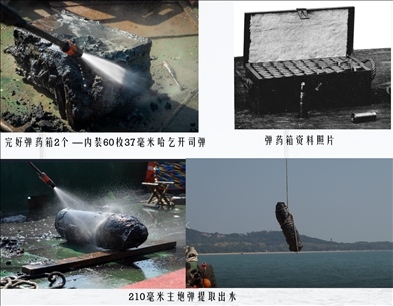 靖遠艦于舯部發(fā)現(xiàn)2箱完好的37毫米哈乞開司炮彈、艏部發(fā)現(xiàn)1枚210毫米主炮開花彈。