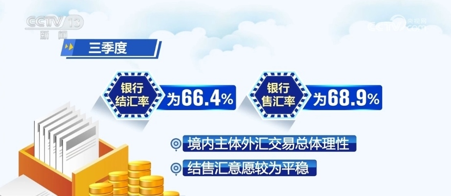 三季度,銀行結(jié)匯率為66.4%、銀行售匯率為68.9%。境內(nèi)主體外匯交易總體理性,結(jié)售匯意愿較為平穩(wěn)。