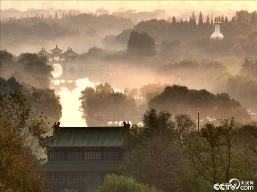 江蘇揚(yáng)州,瘦西湖風(fēng)景區(qū)云霧繚繞,如夢似幻。