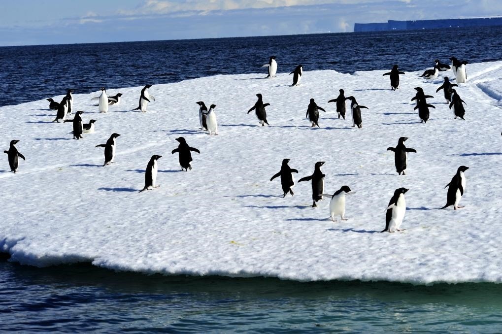 在羅斯海海冰上棲息的阿德利企鵝。新華社記者 張建松 攝