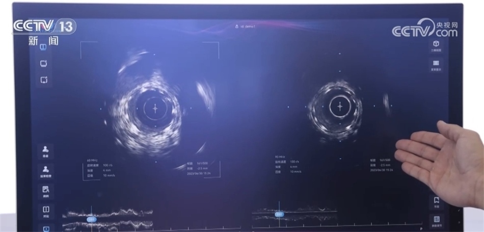 總臺央視記者 褚爾嘉:這里是一個傳統(tǒng)的血管的超聲圖像,我們可以看到血管的全貌。右邊這里是一個工作頻率高達100兆赫茲的超高頻的血管內(nèi)超聲圖像,通過技術(shù)升級,現(xiàn)在我們可以更加清晰地看到冠狀動脈的精細結(jié)構(gòu),這也是目前世界上清晰度最高的一個血管內(nèi)的超聲圖像。