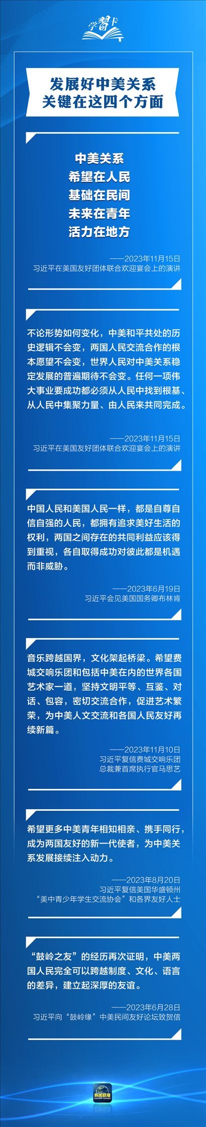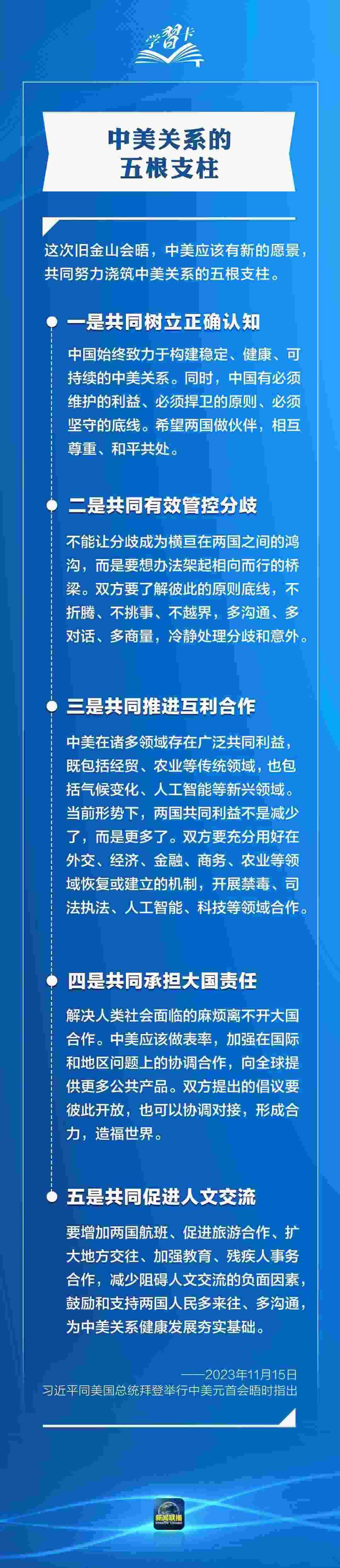 習(xí)近平多次指出,作為兩個世界大國,中美能否確立正確相處之道,攸關(guān)世界和平發(fā)展和人類前途命運。發(fā)展中美關(guān)系,習(xí)主席強調(diào)三點原則、四個方面、五根支柱,一起學(xué)習(xí)→