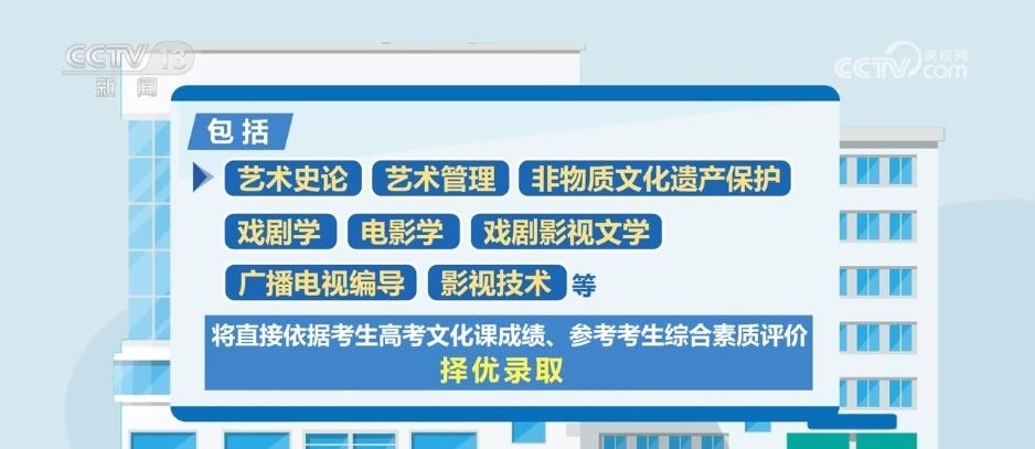 據(jù)了解,藝術類專業(yè)依據(jù)考生高考文化成績、專業(yè)考試成績,參考綜合素質評價進行招生錄取。此次藝考改革一個重要的變化是,部分藝術類專業(yè)不再組織專業(yè)考試,包括藝術史論、藝術管理、非物質文化遺產(chǎn)保護、戲劇學、電影學、戲劇影視文學、廣播電視編導、影視技術等,將直接依據(jù)考生高考文化課成績、參考考生綜合素質評價,擇優(yōu)錄取。