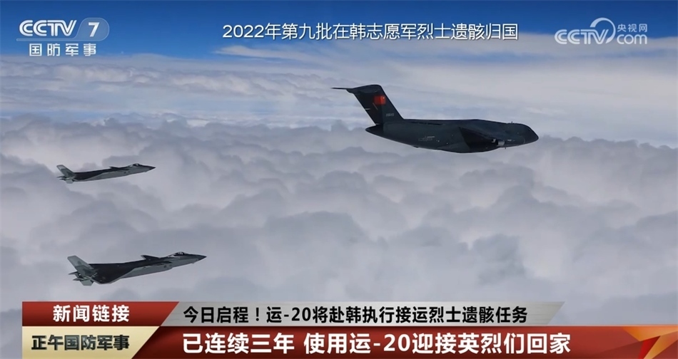今年是中國(guó)人民志愿軍抗美援朝出國(guó)作戰(zhàn)勝利70周年。在偉大的抗美援朝戰(zhàn)爭(zhēng)中,197000多名中國(guó)人民志愿軍光榮犧牲。黨和國(guó)家高度重視在韓志愿軍烈士遺骸歸國(guó)安葬工作,2014年以來(lái),中韓雙方遵循人道主義精神,已成功交接913位在韓志愿軍烈士遺骸。今年也是按照中韓雙方達(dá)成共識(shí)的第十次交接。值得一提的是,十次交接,中國(guó)空軍都執(zhí)行為專機(jī)護(hù)航的任務(wù)。從2020年起,我國(guó)已經(jīng)連續(xù)三年使用運(yùn)-20接迎英烈回家,今年是第四年。而從去年開始,更是“雙20”列陣長(zhǎng)空,告慰英烈。
