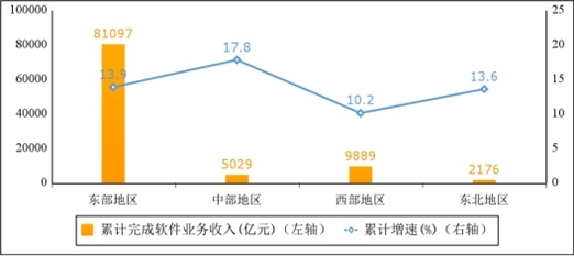 西部地區(qū)軟件業(yè)務(wù)收入小幅提升,中部地區(qū)增勢突出。1—10月份,東部地區(qū)完成軟件業(yè)務(wù)收入81097億元,同比增長13.9%,增速較前三季度回落0.2個百分點;中部地區(qū)完成軟件業(yè)務(wù)收入5029億元,同比增長17.8%,增速較前三季度提高5.7個百分點;西部地區(qū)完成軟件業(yè)務(wù)收入9889億元,同比增長10.2%,增速較前三季度提高0.3個百分點;東北地區(qū)完成軟件業(yè)務(wù)收入2176億元,同比增長13.6%,增速與前三季度持平。四個地區(qū)軟件業(yè)務(wù)收入在全國總收入中的占比分別為82.6%、5.1%、10.1%和2.2%。