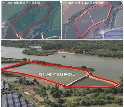 2023年11月23日,督察組現(xiàn)場督察使用無人機(jī)拍攝,儋州市光村鎮(zhèn)位于生態(tài)保護(hù)紅線內(nèi)21.9畝紅樹林被陸續(xù)砍伐。(督察組供圖)