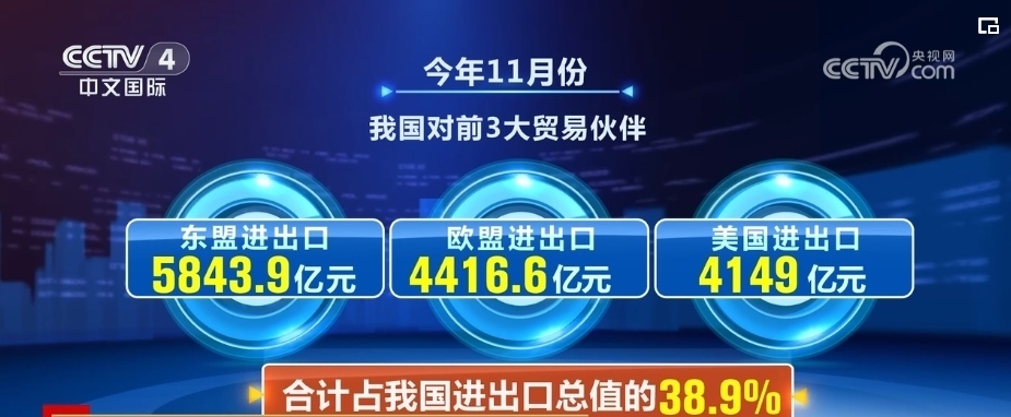 同時,對部分傳統(tǒng)市場貿(mào)易也出現(xiàn)積極變化。我國對前三大貿(mào)易伙伴東盟、歐盟、美國分別進(jìn)出口5843.9億元、4416.6億元、4149億元,合計占我國進(jìn)出口總值的38.9%。11月當(dāng)月,中美貨物貿(mào)易同比增長2.7%,結(jié)束連續(xù)6個月的同比下降,環(huán)比增長4.3%。