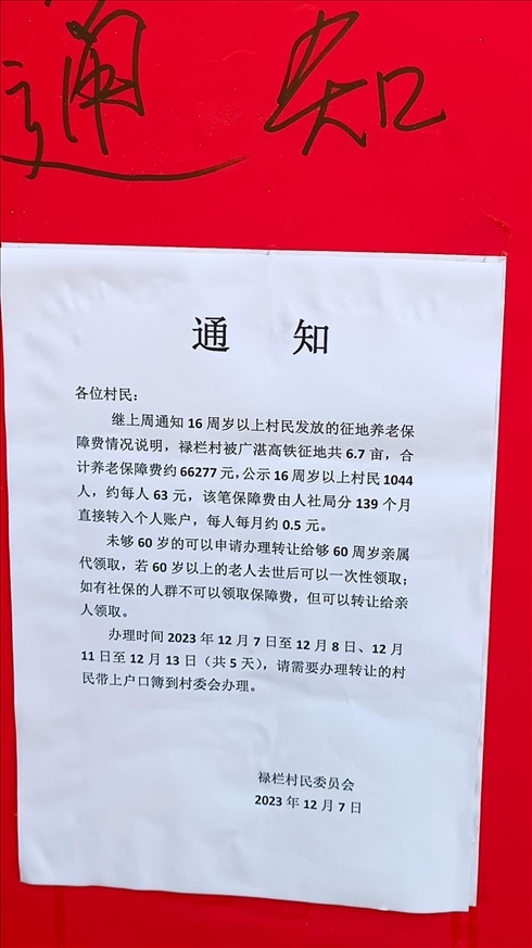 ·廣東一村發(fā)征地養(yǎng)老保障費每人每月0.5元?村委會回應(yīng)稱錢少人多。