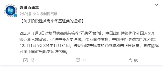 ·外交部領(lǐng)事保護中心:階段性減免來華簽證費。