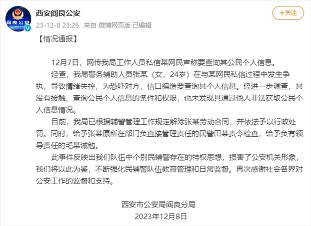 ·西安閻良公安通報警務(wù)輔助人員稱要查網(wǎng)友個人信息:解除勞動合同,予以行政處罰。