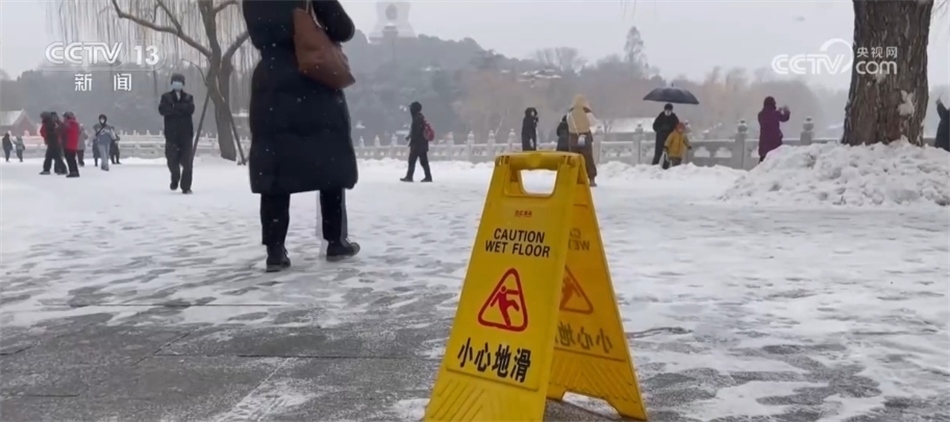 北海公園信息傳媒科副科長 張磊:主要是在門區(qū)、洗手間以及重點(diǎn)的景區(qū),同時(shí)我們也設(shè)置了“小心地滑”的這種提示牌130余處,此次降雪時(shí)間由于比較長,公園也采用了“機(jī)械+人工掃雪”的這種方式,爭取做到了隨掃隨清,保證主路的暢通。