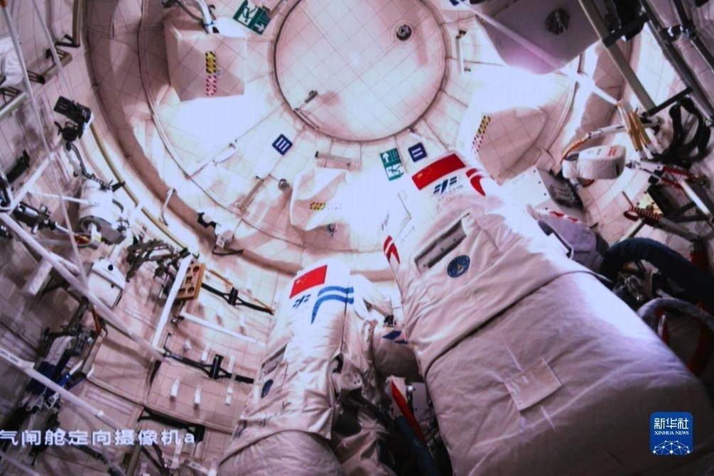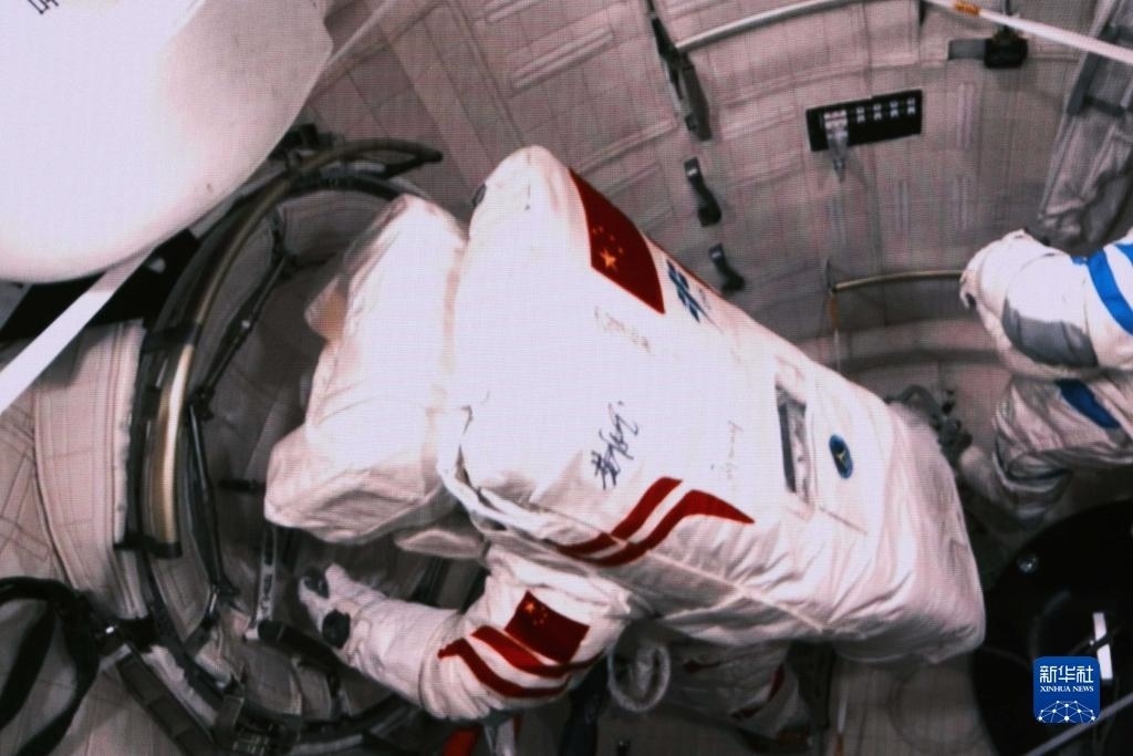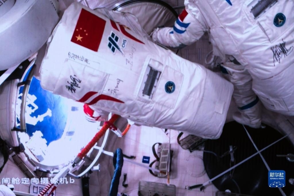 12月21日在北京航天飛行控制中心拍攝的神舟十七號(hào)航天員江新林協(xié)同兩名艙外航天員實(shí)施出艙活動(dòng)的畫面。新華社記者 李杰 攝