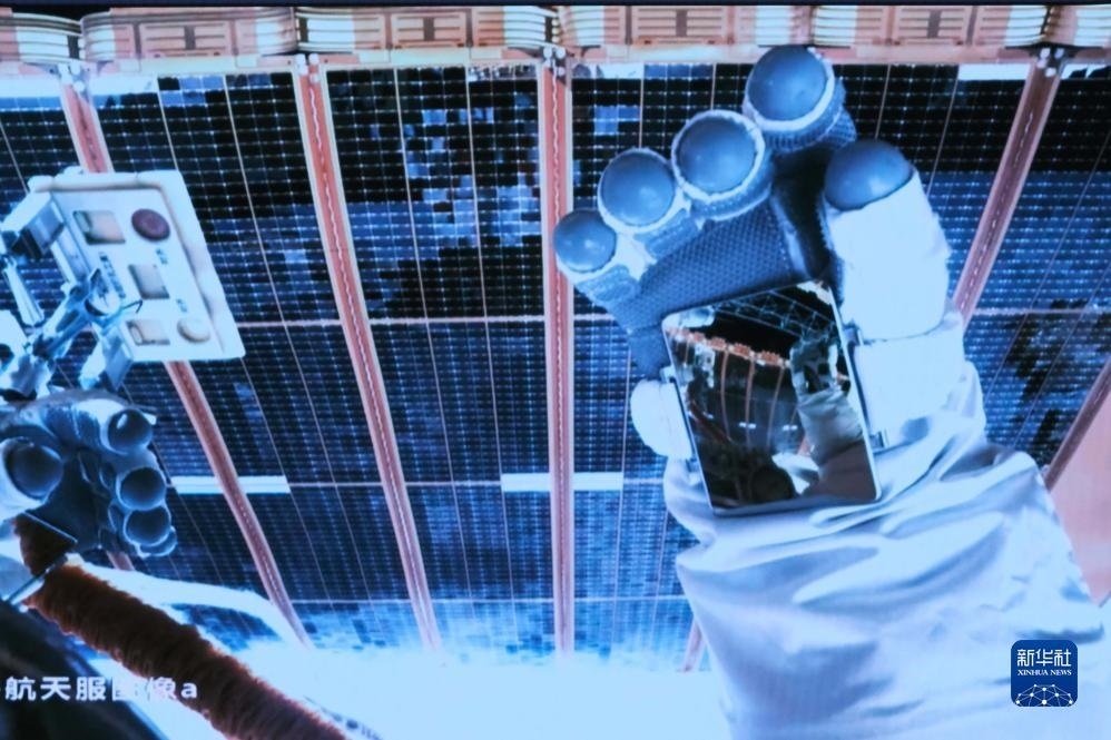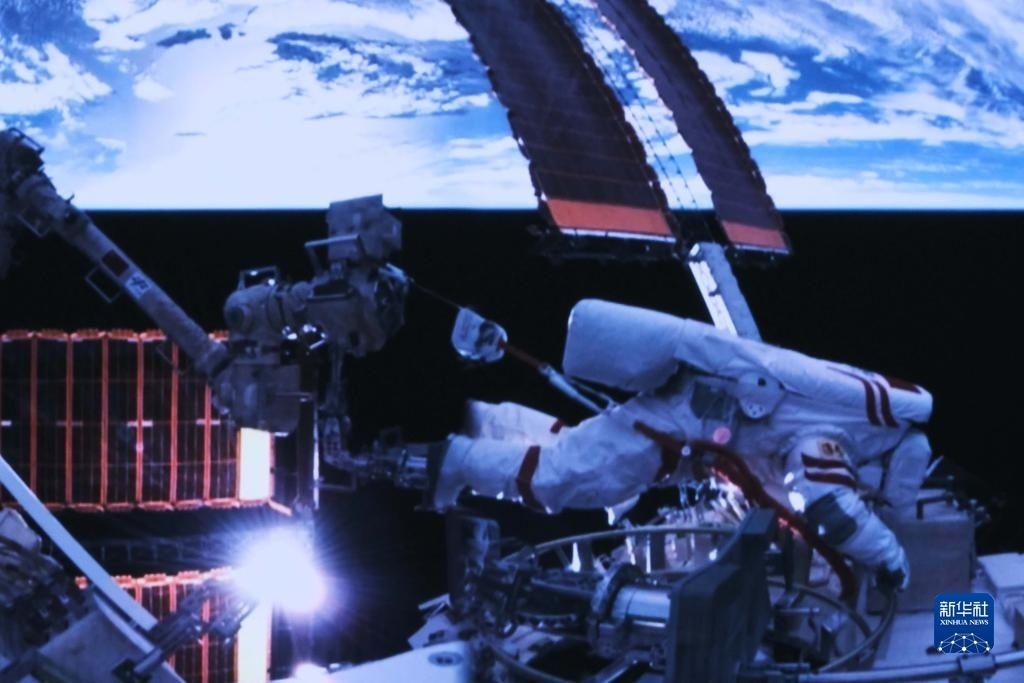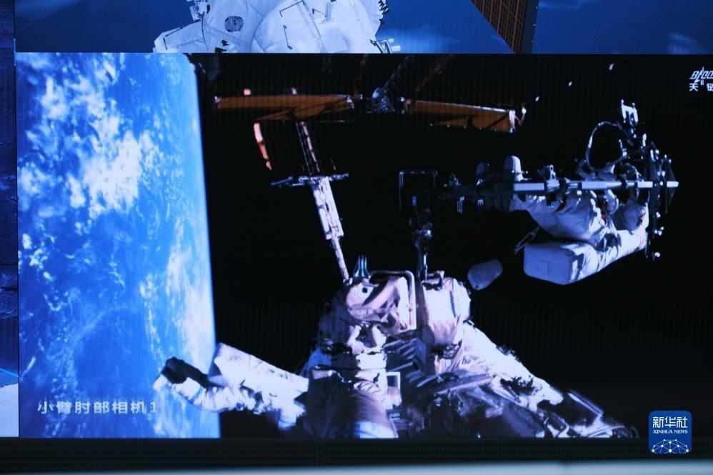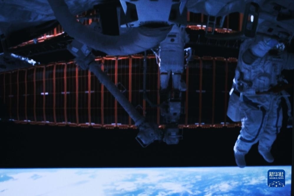 12月21日在北京航天飛行控制中心拍攝的神舟十七號(hào)航天員湯洪波開展艙外操作的畫面。新華社記者 李杰 攝