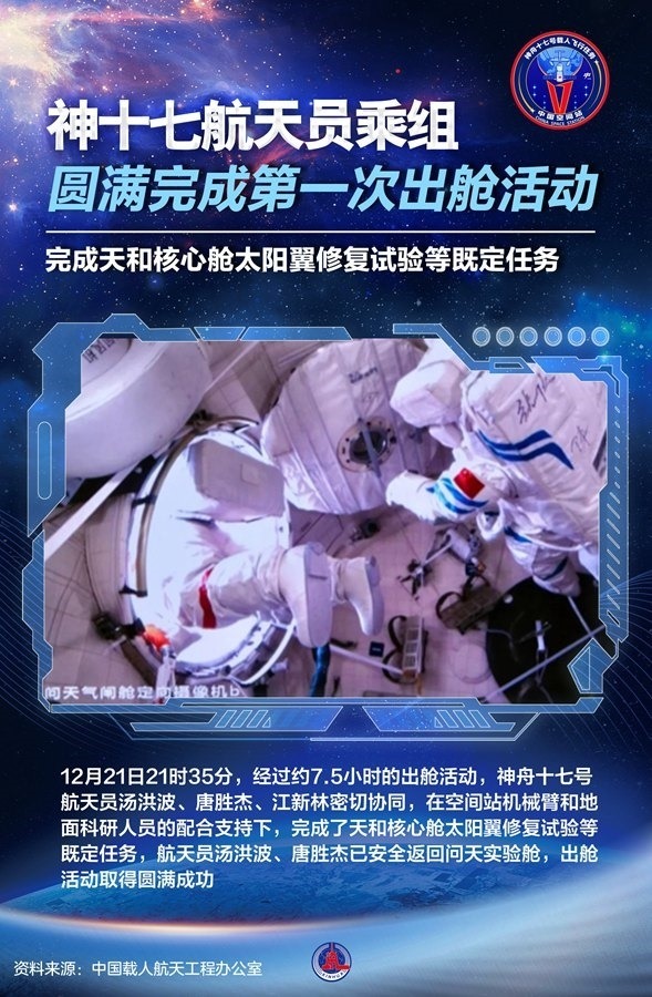 據(jù)中國(guó)載人航天工程辦公室介紹,21日21時(shí)35分,經(jīng)過約7.5小時(shí)的出艙活動(dòng),神舟十七號(hào)航天員湯洪波、唐勝杰、江新林密切協(xié)同,在空間站機(jī)械臂和地面科研人員的配合支持下,完成了天和核心艙太陽翼修復(fù)試驗(yàn)等既定任務(wù),航天員湯洪波、唐勝杰已安全返回問天實(shí)驗(yàn)艙,出艙活動(dòng)取得圓滿成功。