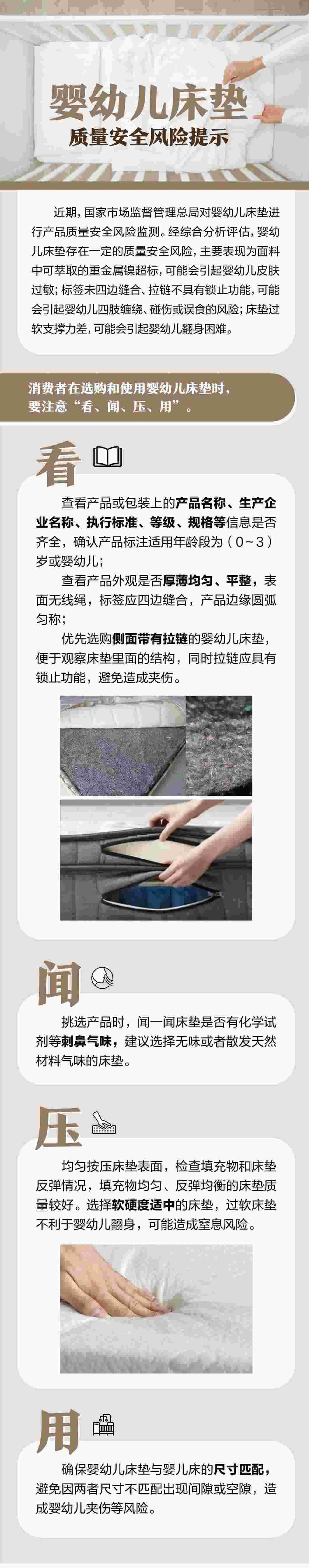 嬰幼兒床墊存在一定的質(zhì)量安全風(fēng)險(xiǎn),主要表現(xiàn)為面料中可萃取的重金屬鎳超標(biāo),可能會引起嬰幼兒皮膚過敏;標(biāo)簽未四邊縫合、拉鏈不具有鎖止功能,可能會引起嬰幼兒四肢纏繞、碰傷或誤食的風(fēng)險(xiǎn);床墊過軟支撐力差,可能會引起嬰幼兒翻身困難。