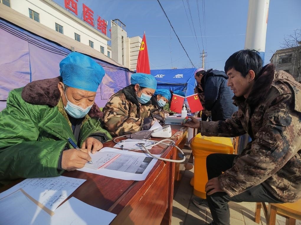12月21日,在積石山中西醫(yī)結合醫(yī)院門外馬路邊,醫(yī)生為受災群眾看病。新華社記者 范培珅 攝