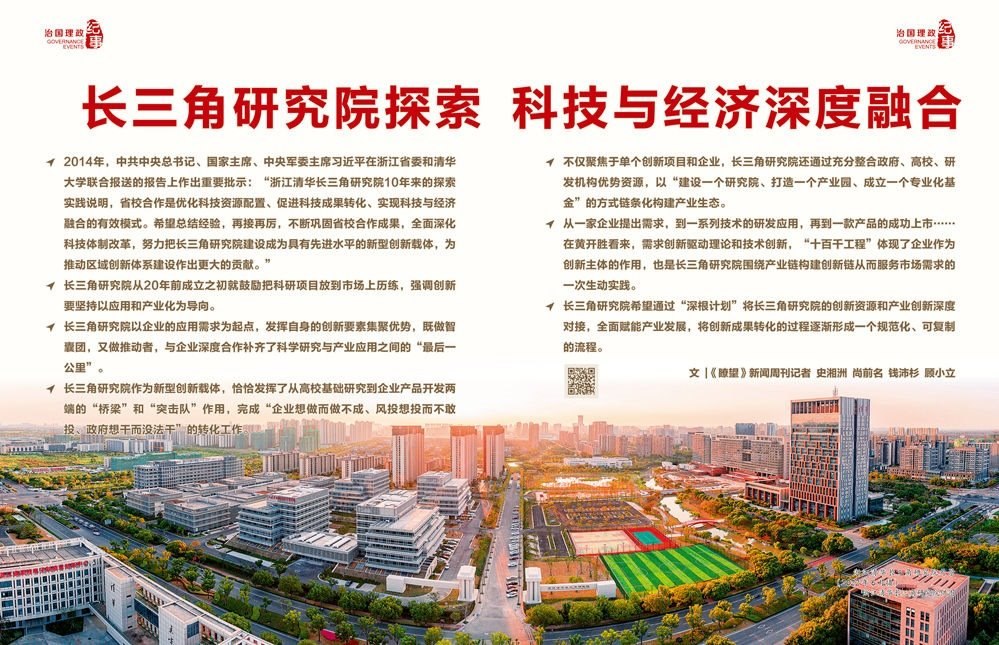 2003年底,在時任浙江省委書記習(xí)近平的親自推動下,浙江清華長三角研究院(以下簡稱“長三角研究院”)正式成立,落地浙江嘉興。作為浙江省人民政府與清華大學(xué)共建的新型創(chuàng)新載體,長三角研究院成立以來立足浙江、面向長三角,以自收自支、市場化運營探索走出一條省校合作的有效模式,逐步成長為長三角區(qū)域重要的產(chǎn)學(xué)研試驗平臺和成果轉(zhuǎn)化基地。