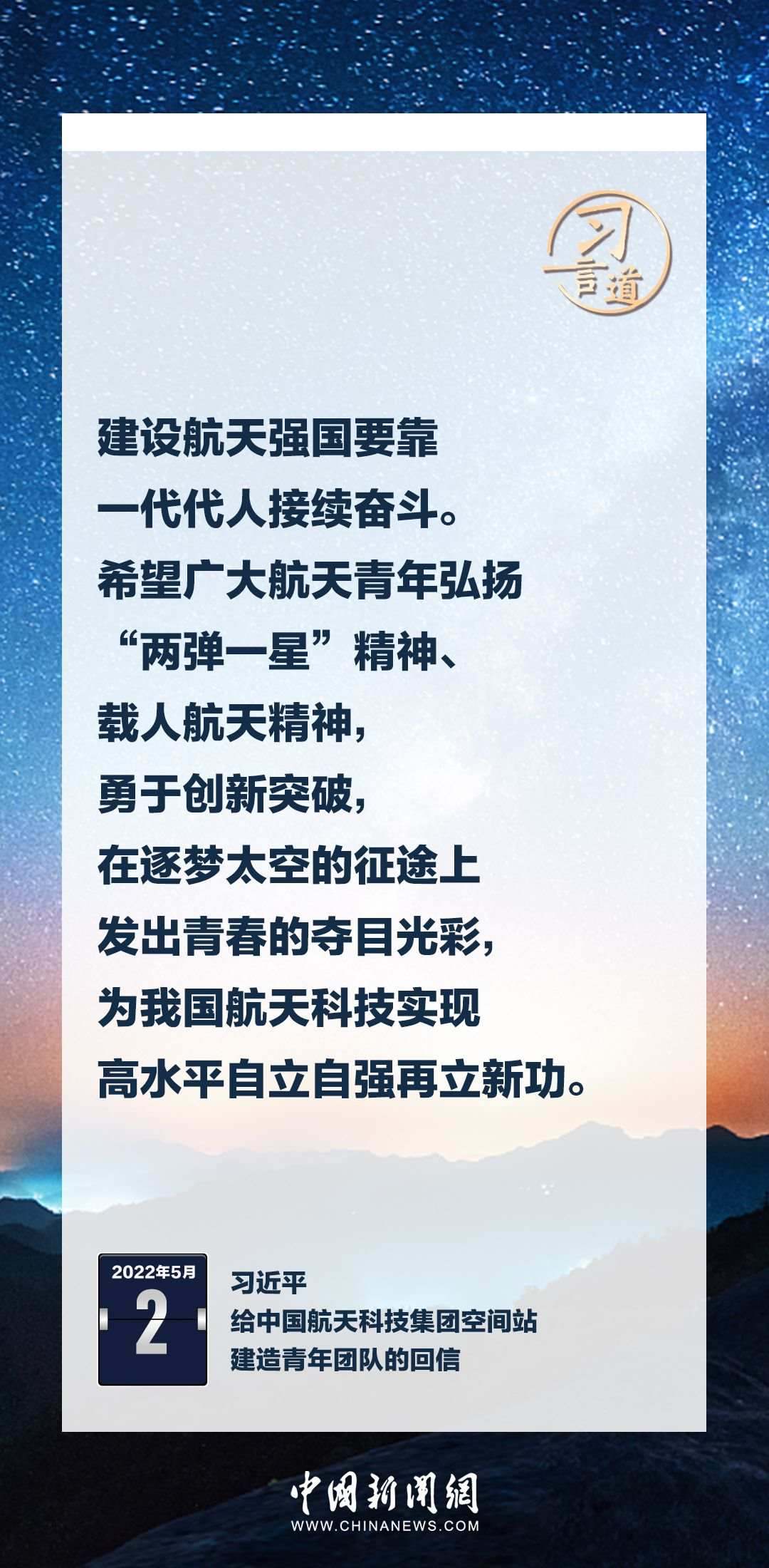 建設(shè)航天強國要靠一代代人接續(xù)奮斗。在不同場合,習(xí)近平總書記頻頻提及航天精神,激勵一代代中國人不斷奮進、筑夢太空。