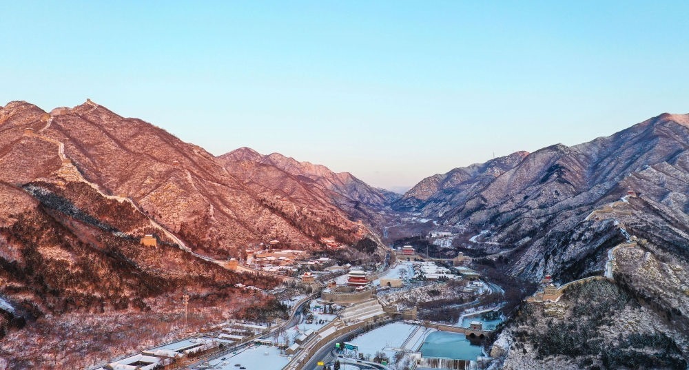 朝陽(yáng)灑在雪后的居庸關(guān)長(zhǎng)城上(無(wú)人機(jī)照片,2023年12月16日攝)。