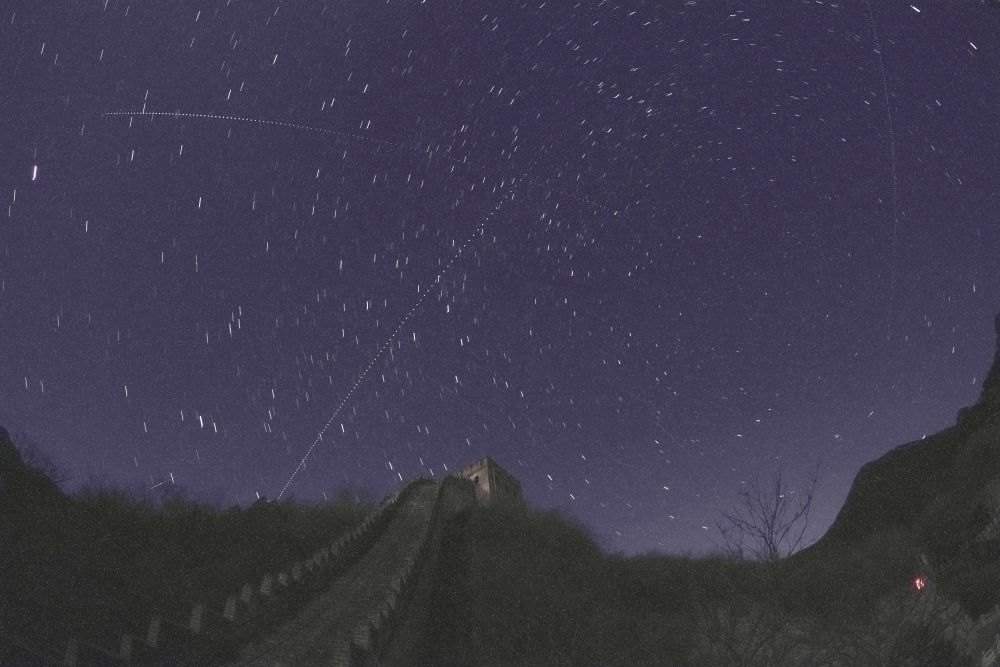 在北京延慶水關(guān)長(zhǎng)城拍攝的中國(guó)空間站過(guò)境照片(從左下向右上的軌跡為中國(guó)空間站,軌跡為多張照片堆棧,2021年12月12日攝)。