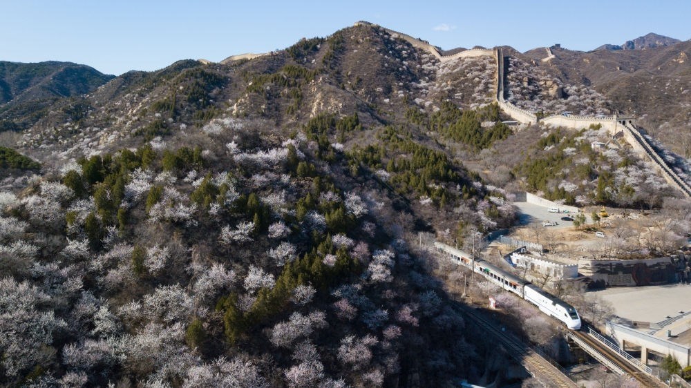 一列火車(chē)在北京水關(guān)長(zhǎng)城附近的山花中穿行(無(wú)人機(jī)照片,2020年3月27日攝)。