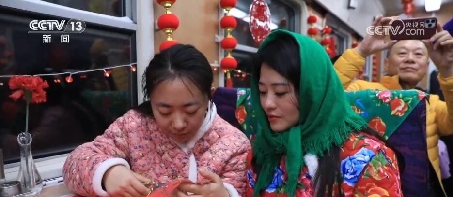 總臺央視記者 楊曜語:一上車,我就被濃濃的東北文化所感染到了,整個車廂都被東北大花的經典配色裝飾著,再加上隨手就能品嘗到的特色美食,坐在床鋪上就感覺一秒鐘“穿越”到農家炕頭。跟著游客,我現在到了一節(jié)互動車廂,這里被布置成“跨年狂歡”的主題場景,在這里游客可以參與剪窗花、包餃子、穿東北大花襖一系列特色活動,現在就有很多游客在這里打卡拍照。