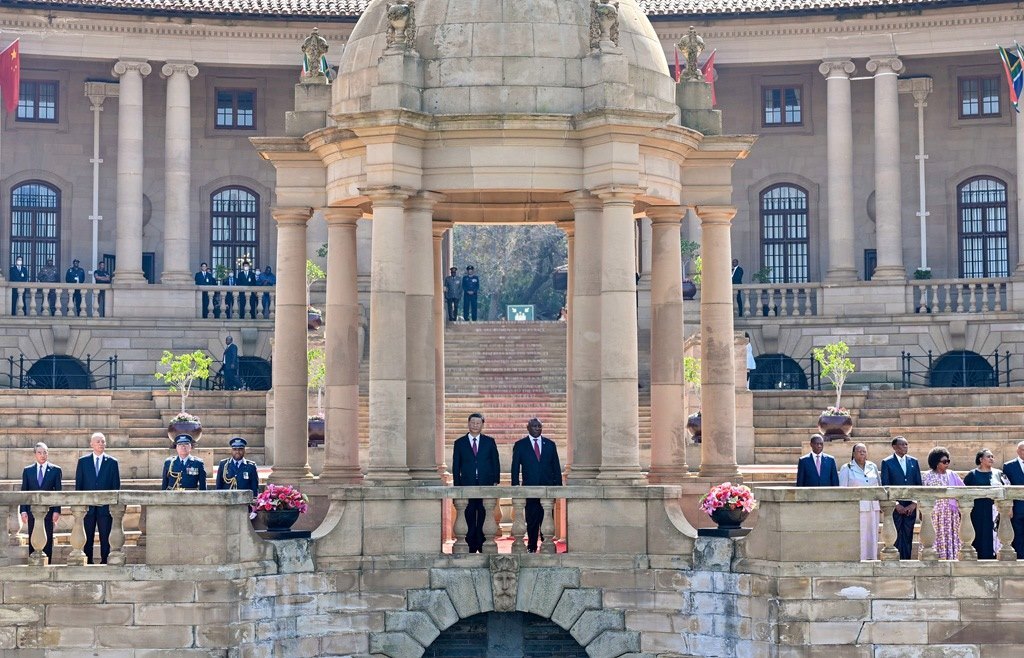 當(dāng)?shù)貢r(shí)間2023年8月22日上午,正在南非進(jìn)行國事訪問的國家主席習(xí)近平在比勒陀利亞總統(tǒng)府同南非總統(tǒng)拉馬福薩會(huì)談。會(huì)談前,拉馬福薩在總統(tǒng)府廣場為習(xí)近平舉行歡迎儀式。
